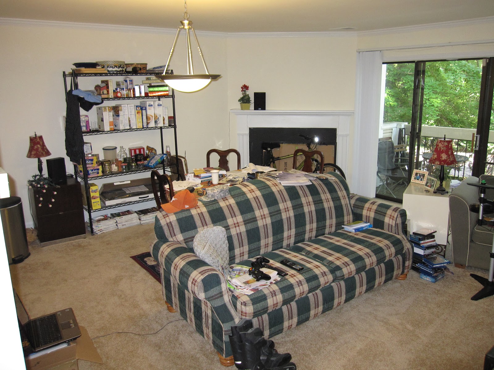 The chandelier light is positioned very inconveniently, but I like having the table against the back of the sofa. We'll see if things stay this way, but for now, I'm liking it. Once I get a drill, I'll hang the T.V. up, so I can get a cabinet for discs/machines. This should clean up quite a bit.